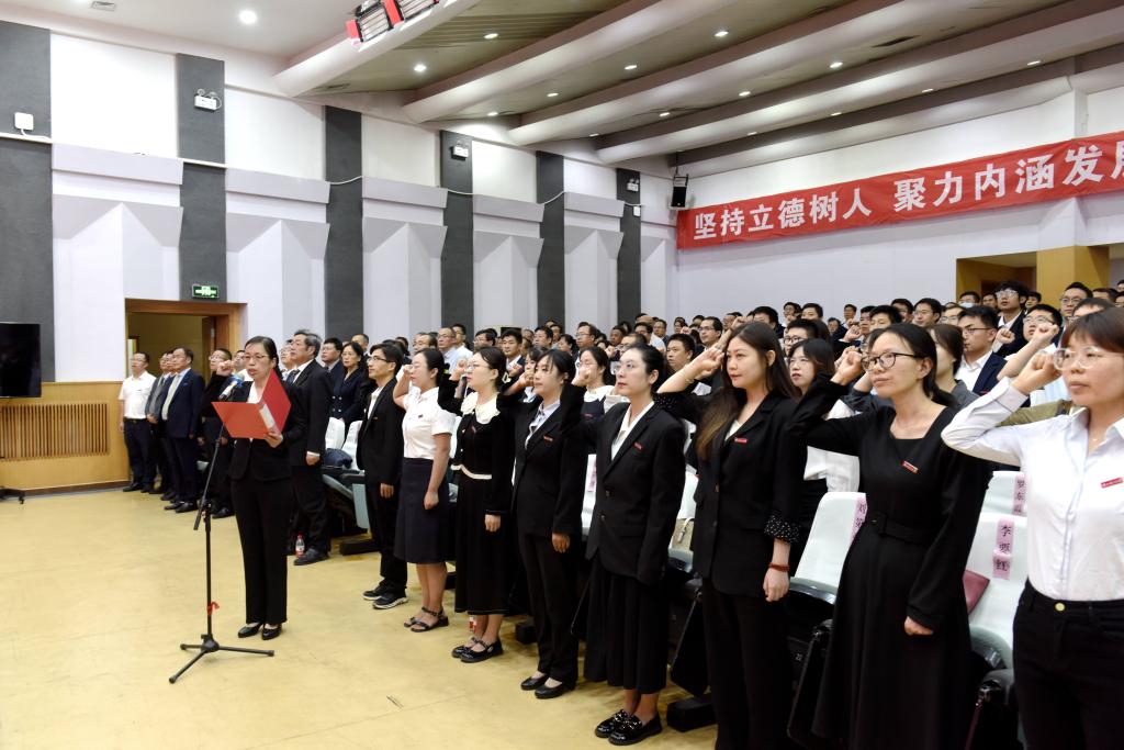 在雄壮的国歌声中,庆祝大会正式开始。新入职教师在“甘肃省五一劳动奖章”获得者材料科学与工程学院曹睿的带领下,面对国旗庄严宣誓。