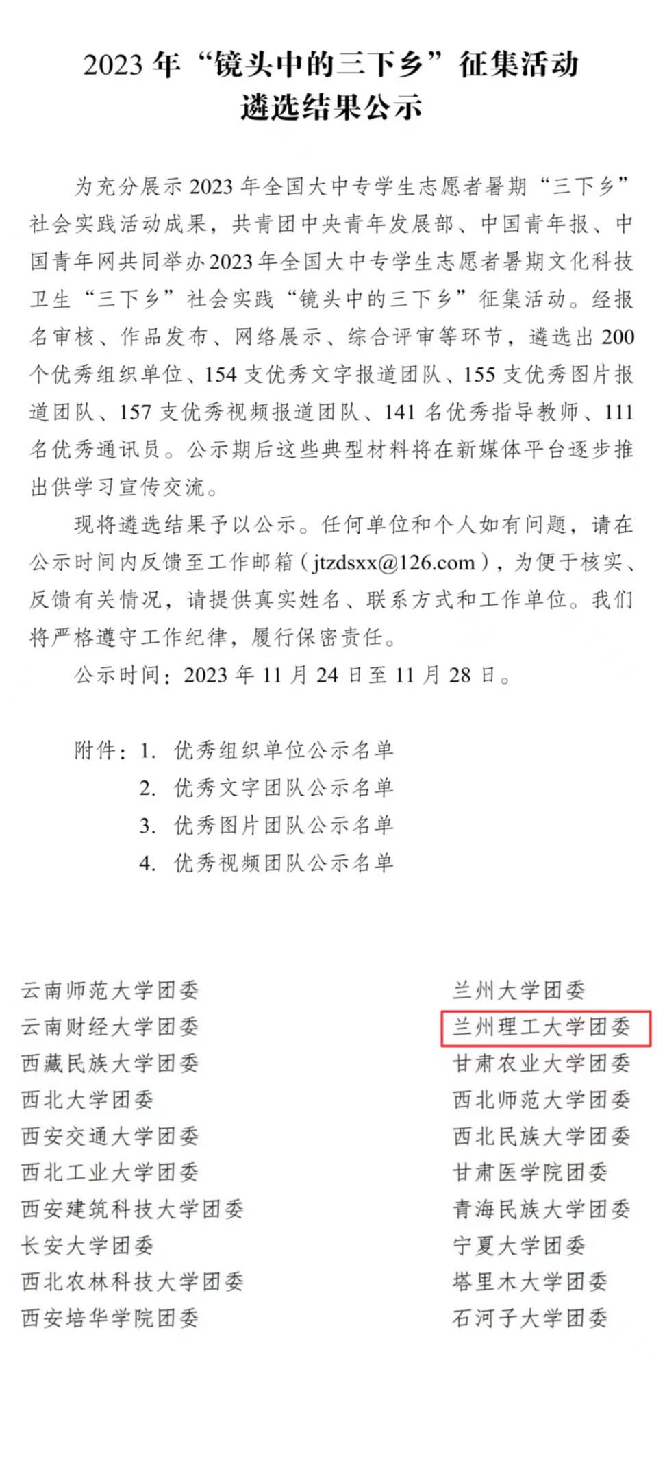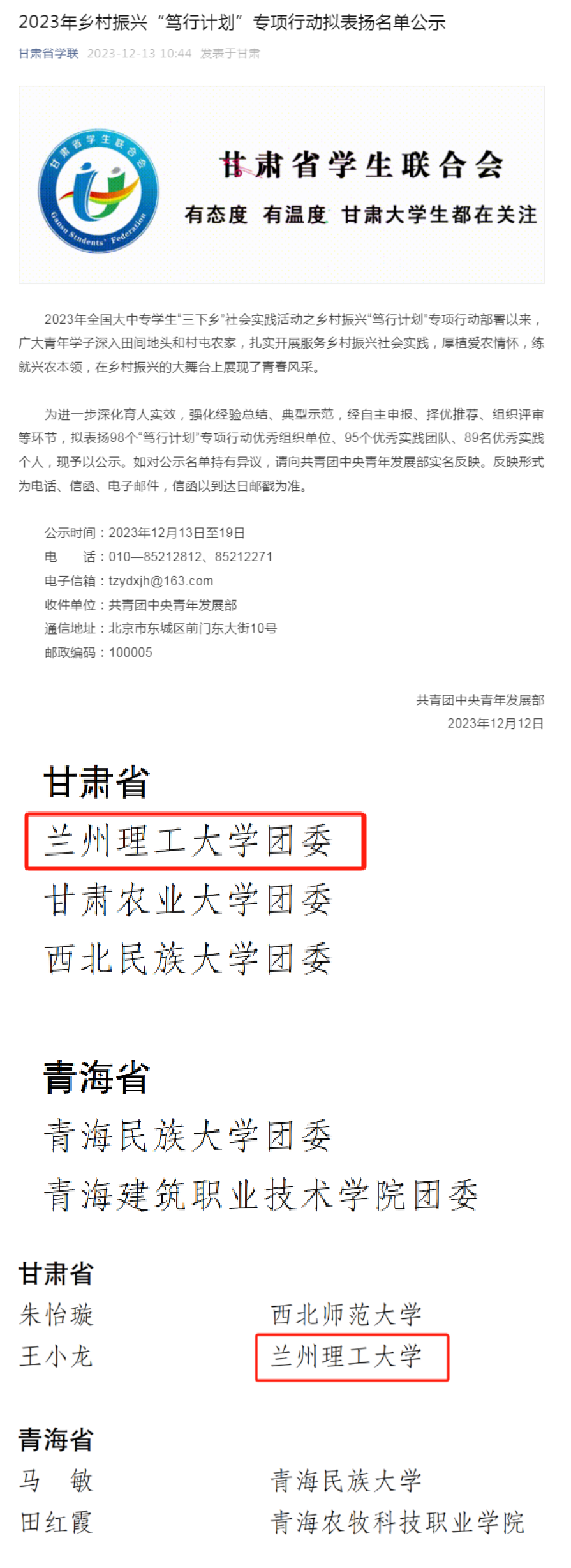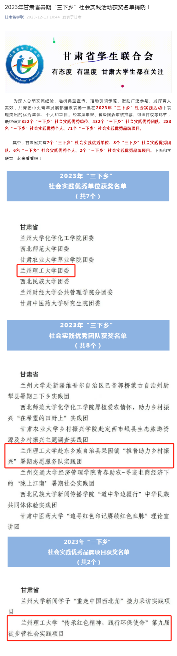 近日,团中央通报公示2023年全国大中专学生志愿者暑期文化科技卫生“三下乡”社会实践活动总结结果,我校获评共青团中央“三下乡”社会实践优秀单位,学校赴东乡族自治县果园镇“推普助力乡村振兴”暑期志愿服务队被评为“三下乡”社会实践优秀团队,“传承红色精神,践行环保使命”第九届徒步营社会实践项目被评为“三下乡”社会实践优秀品牌项目。此外,学校还获得2023年镜头中的三下乡优秀组织单位、2023年全国大中专学生“三下乡”社会实践活动乡村振兴“笃行计划”优秀组织单位荣誉称号,土木工程学院王小龙获“笃行计划”优秀实践个人。兰州理工大学土木工程学院返璞归真实践队、“一棵花椒树,万千致富梦”赴陇南市武都区乡村振兴调研团、兰州理工大学红柳学子德国研学团队获得2023年大学生社会实践成果“千校千项”网络展示活动“优秀项目”。兰州理工大学“石榴花开,同心同梦”各民族青少年交流实践队获2023年全国“三下乡”“新疆学子百村行”专项社会实践活动优秀团队。