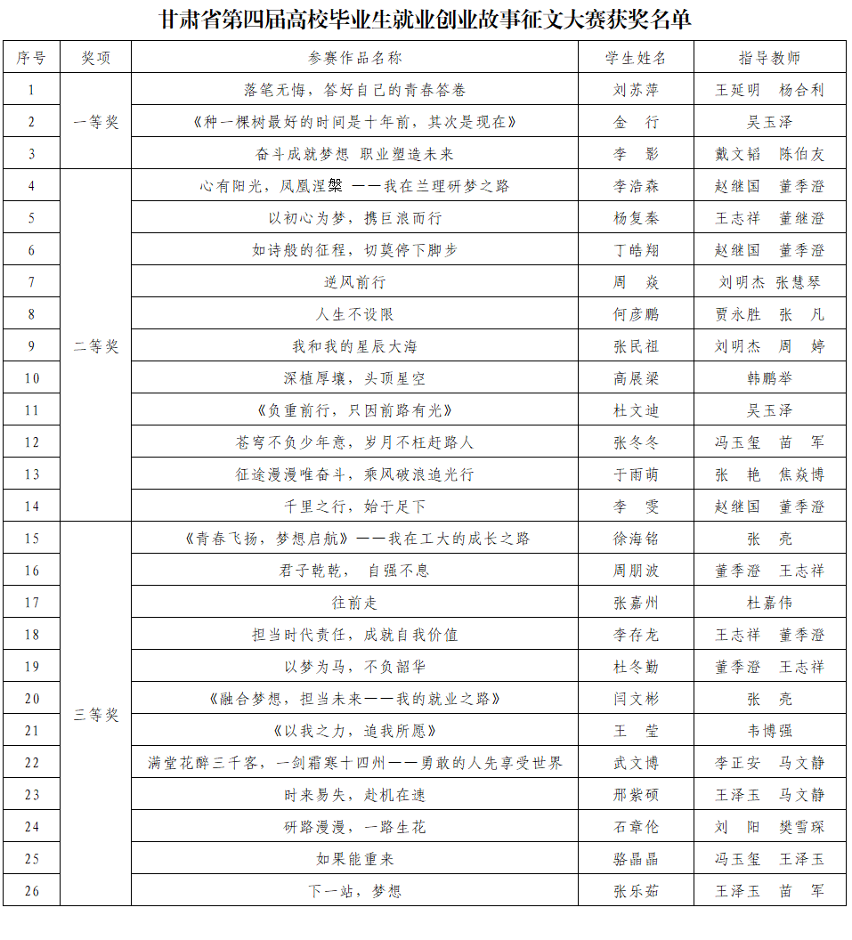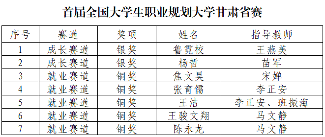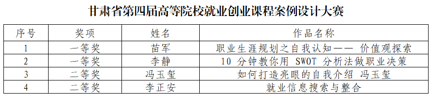近日,由教育部高校学生司指导、甘肃省教育厅主办的首届全国大学生职业规划大学甘肃省赛、甘肃省第四届高等院校就业创业课程案例设计大赛、甘肃省第三届就业创业指导教师职业能力大赛、甘肃省第四届高校毕业生就业创业故事征文大赛等系列赛事圆满落下帷幕。学校在此系列大赛中取得优异成绩,共获一等奖5项、二等奖15项、三等奖19项、优秀奖3项,学校获首届全国大学生职业规划大学甘肃省赛“优秀组织奖”。