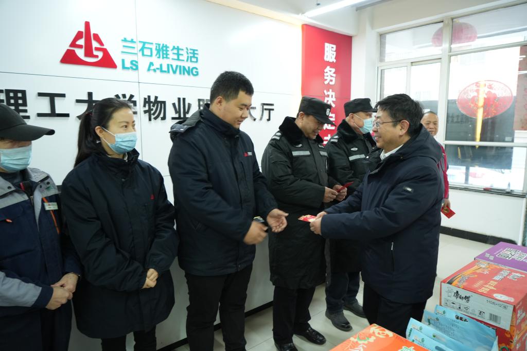 玉兔呈祥辞旧岁,金龙腾飞迎春来。2月9日上午,正值农历除夕,学校党委书记夏天东看望慰问了春节期间留校同学和在岗职工,向他们及家人致以新春的美好祝福,感谢他们用辛勤的付出保障春节期间校园的正常运转。学校相关单位负责同志陪同慰问。