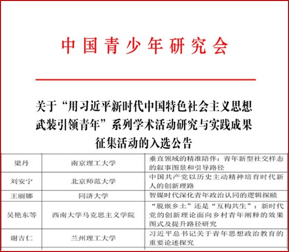 4月2日,中国青少年研究会发布了面向社会公开征集的“用习近平新时代中国特色社会主义思想武装引领青年”学术活动研究与实践成果公告,石油化工学院党委申报的《习近平总书记关于青年思想政治教育的重要论述研究》论文入选。