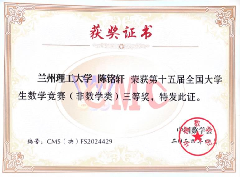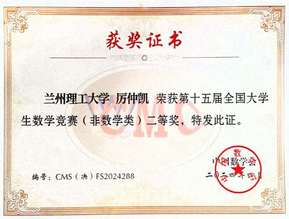 本次竞赛初赛于2023年10月举行,我校获得甘肃省一等奖32项,二等奖67项,三等奖108项,经选拔我校3名同学代表甘肃赛区参加全国决赛。决赛中2021级自动化专业厉仲凯获得非数学专业类二等奖、2021级机器人工程专业陈铭轩获得非数学专业三等奖。