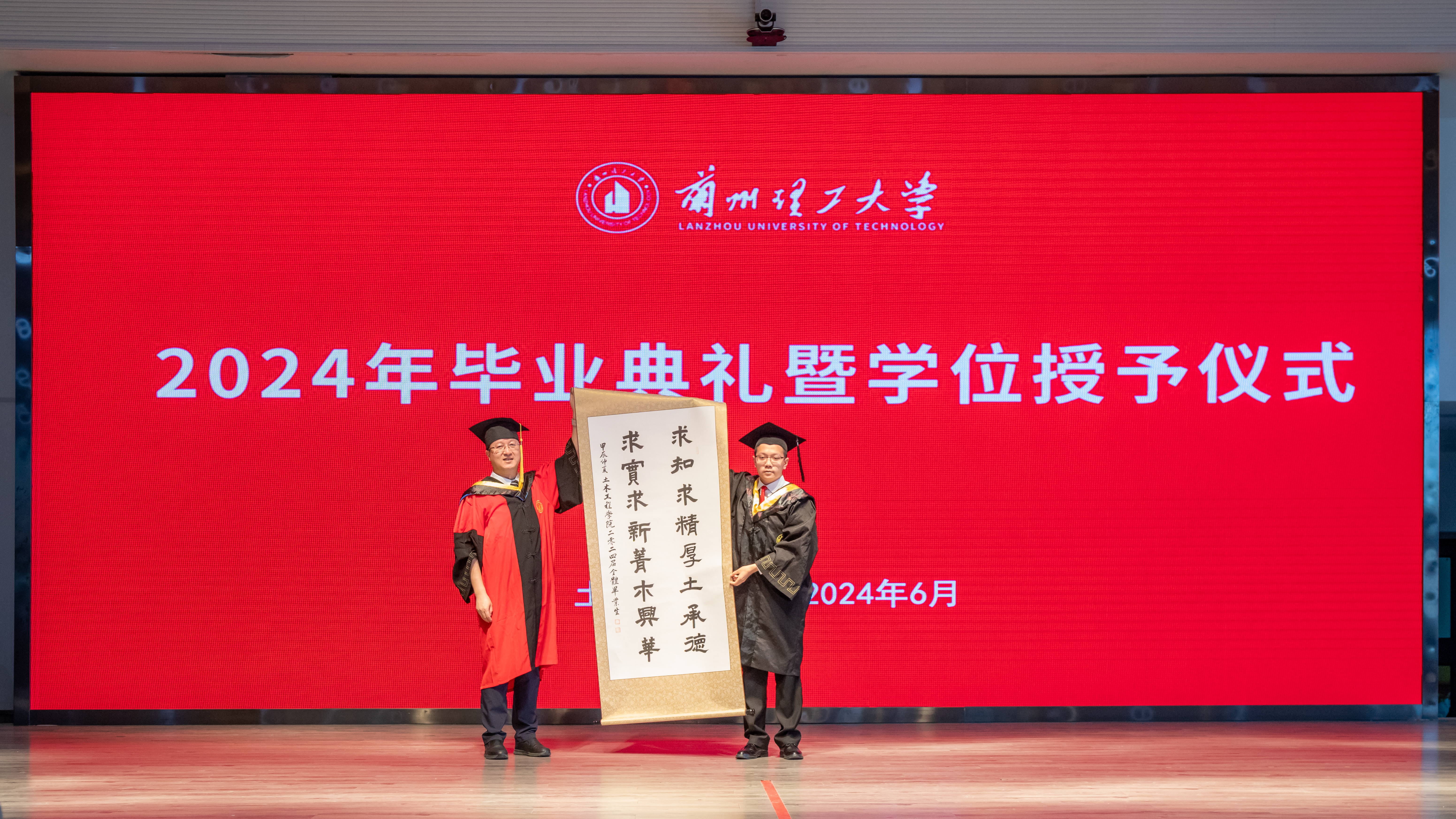 郭旭隽为毕业生代表佩戴校徽,全场师生一同重温学校“红柳精神”。她向完满完成学业的同学表示由衷祝贺并提出希望:坚定理想信念,做胸怀大志的“厚德”青年;坚持终身学习,做奋进上进的“博学”青年;矢志艰苦奋斗,做勇担重任的“实干”青年。秉承“奋进求是”校训,用实际行动在祖国建设中续写兰理工土木学子的青春奋斗华章。