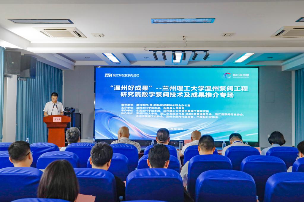 为深入贯彻创新驱动发展战略,加强校地企合作,促进高价值科技成果与高质量科技企业的精准对接,2024年8月20日下午,一场以“数字泵阀技术”为核心的成果推介活动在兰州理工大学温州泵阀工程研究院举行。本次活动在温州市校(院)地科技成果转化联合办公室的精心指导下,由温州市科学技术局、永嘉县人民政府主办,永嘉县科学技术局、兰理工温州泵阀院等单位联合举办,汇聚了行业精英与学术专家。