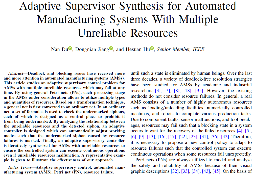 近日,自动化与电气工程学院杜楠副教授、蒋栋年教授携手西安电子科技大学胡核算教授,在控制科学与工程领域国际顶级期刊《IEEE Transactions on Systems,Man, and Cybernetics:Systems》(中国科学院一区Top,影响因子8.7)合作发表题为“Adaptive supervisor synthesis for automated manufacturing systems with multiple unreliable resources”的高水平学术论文,该研究成果为自动制造系统的自适应死锁监督控制提供了重要的理论支撑与技术参考。