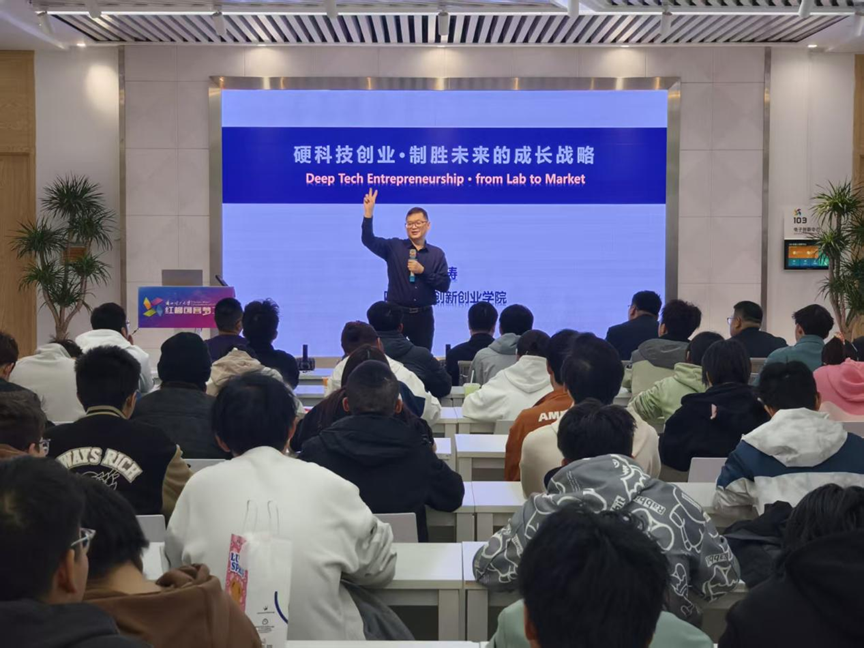 讲座中,许涛教授以“好奇心—科学—创新—创业”为主线,深刻阐释了硬科技的时代价值与人才成长的内在逻辑。他指出,从古腾堡印刷机推动文艺复兴,到智能手机集成多项诺奖级技术,再到量子科技、人工智能、脑机接口等前沿领域,硬科技始终是时代进步的核心驱动力。他提到,人才成长需要宽松自主的环境,基于好奇心与兴趣的学习,聚焦热爱的赛道持续深耕即可实现突破。许教授通过丰富的案例,生动诠释了“解决实际需求、小切口突破”的创新逻辑。无论是年龄还是学历背景,只要保持好奇心、敢于实践,都能把握创新机会。讲座现场,同学们专注聆听,互动环节踊跃提问,气氛热烈。
