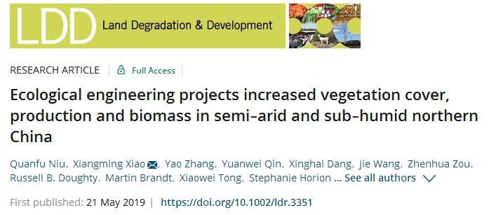 2019年5月,土木工程学院牛全福副教授带领的研究团队在国际期刊《Land Degradation & Development》上发表了题为“Ecological engineering projects increased vegetation cover, production and biomass in semi‐arid and sub‐humid northern China”的研究论文,该论文由国家自然科学基金(41461084)、兰州理工大学博士基金和中国留基委访学基金共同资助。《Land Degradation & Development》是农林科学和环境科学领域的顶级刊物,土壤科学领域JCR排名全球第一,其2018年影响因子达到7.27。