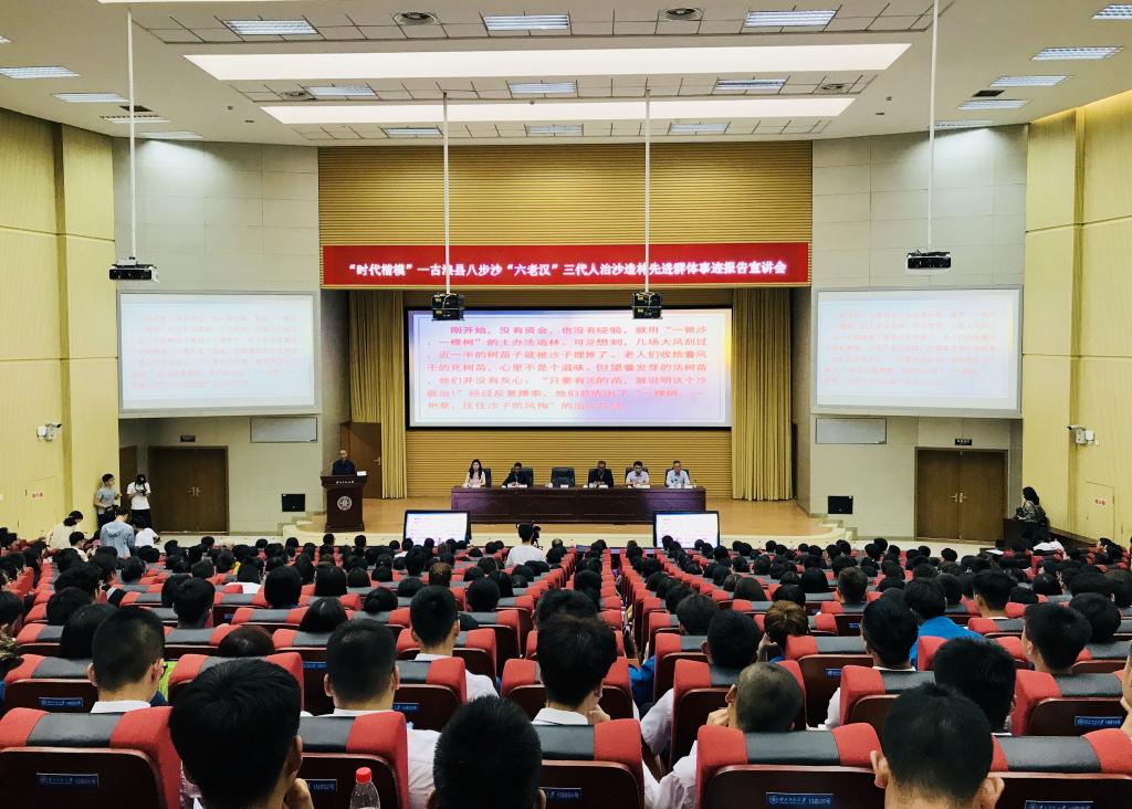 6月11日上午,“时代楷模”——古浪县八步沙林场“六老汉”三代人治沙造林先进群体事迹报告会在西北师范大学新校区毅然报告厅举行,省内13所高校600余人聆听了报告。报告团成员郭万刚、贺中强、郭玺、陈树君、袁洁先后讲述了八步沙林场三代人艰苦奋斗、治沙造林的生动历程,引发了在场听众的强烈共鸣。
