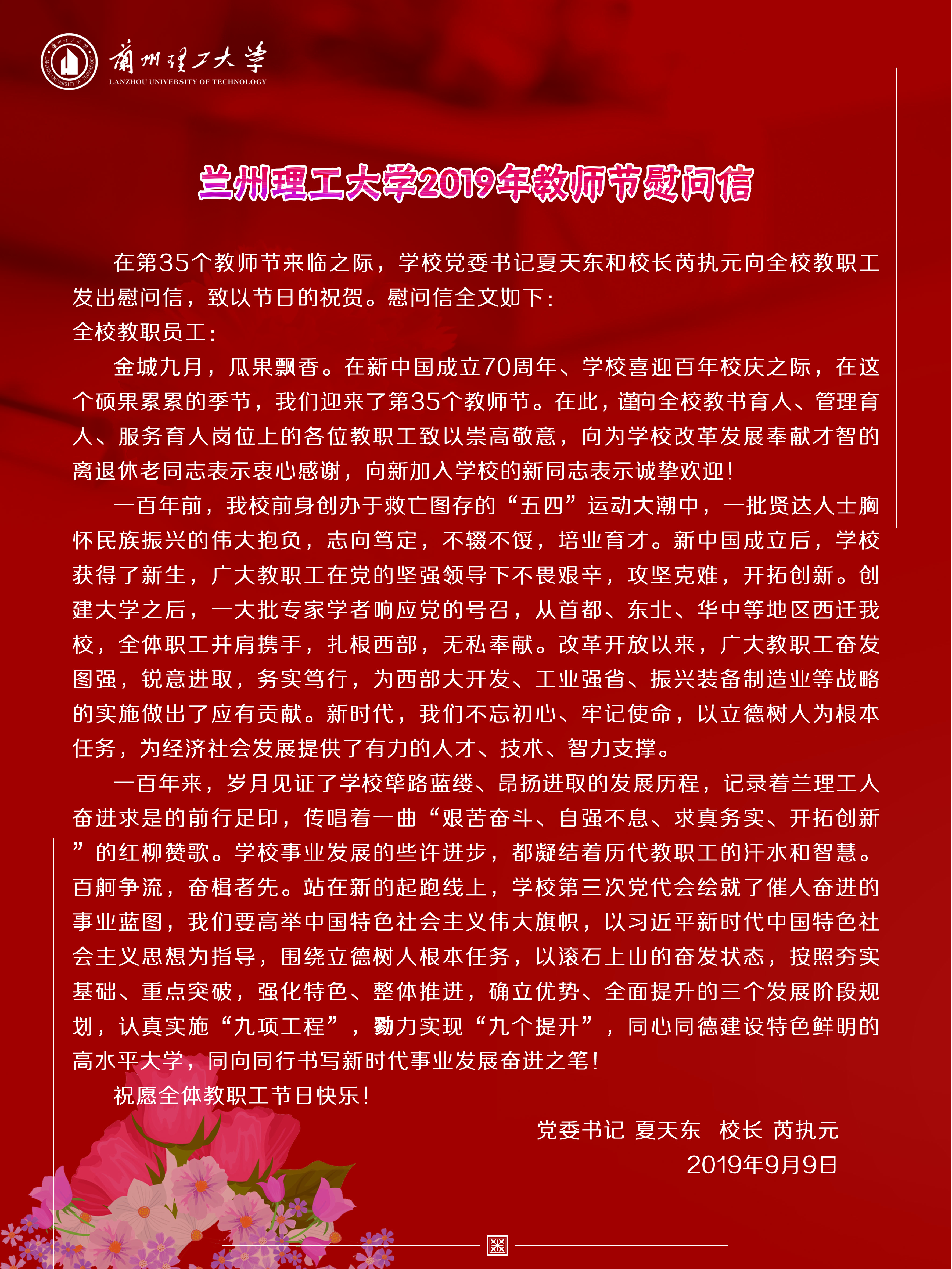 金城九月,瓜果飘香。在新中国成立70周年、学校喜迎百年校庆之际,在这个硕果累累的季节,我们迎来了第35个教师节。在此,谨向全校教书育人、管理育人、服务育人岗位上的各位教职工致以崇高敬意,向为学校改革发展奉献才智的离退休老同志表示衷心感谢,向新加入学校的新同志表示诚挚欢迎!