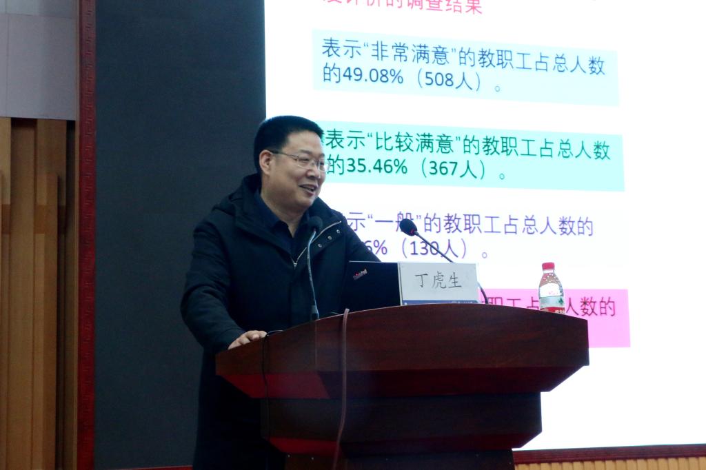 12日下午,丁虎生作题为《学校意识形态工作及教职工思想状况报告》的专题辅导报告。报告指出,高校是各种思想观念交锋的场所,深刻认识和把握抓好高校意识形态工作,是新时代办好中国特色社会主义大学的根本要求,把习近平新时代中国特色社会主义思想作为高校意识形态工作的指导思想,坚守好、建设好高校意识形态坚强阵地,是高校肩负的重要职责。报告强调,大学必须在管理的每个环节上建立平等、民主的关系,大学教师和管理人员一定要了解学生的愿望,关心学生的冷暖疾苦,帮助解决学生的困难,既要教育引导学生,又要帮助关心学生。大学管理人员要把“精通业务、善于组织、熟悉学生、热心服务”作为职业追求,树立严谨务实、勤政廉洁的工作作风。