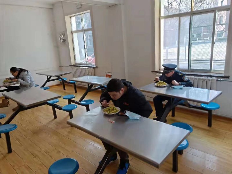 每日对值班食堂进行360°无死角清洁消毒,定时开窗通风,设立废弃口罩专用回收点、提示牌和防控宣传标语;严格饮食物资采购工作,做好索证索票,认真进行收货质量检查,确保食品原材料安全,禁止私自采购不明来源的食材,严禁采购及加工野生动物、活体动物;严把生产操作环节安全,每日对食堂生产制作、售卖、菜肴留样等各环节监督检查,食品加工严格做到生熟分开、蒸熟煮透、食品留样,确保食品卫生安全;合理安排就餐人员单人单桌用餐,保持适当距离保障安全。