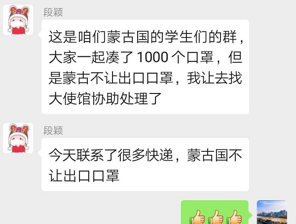 “我们捐赠的口罩无法送达,我们很难过。”这是塔吉克斯坦、蒙古国10名国际学生校友发来的微信,他们在的得知海关关闭和物流不通致使物品无法邮寄,捐款建议又被国际教育学院婉拒后,通过在其他国家的校友购买口罩寄往学校。“冬天即将过去,春天很快来临,祝福母校、祝福中国!”这是他们在邮寄物品上专门贴上的话。