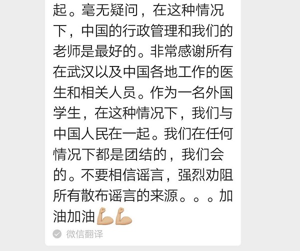 “我们都相信伟大的中国政府及中国人民,在与疫情的战斗中一定会获得胜利!”“在这个为我们提供了学习、生活和安全的第二故乡,我们一起为中国和中国人民加油!”……守望相助、共克时艰,在这个特殊的寒假,身处世界各地的我校国际学生及校友通过微信、邮件等方式表达他们对中国抗击疫情的鼓励和祝福,回国国际学生及校友纷纷向母校捐资捐物。国际学生与学校一道,主动成为疫情阻击战中的一员,在校内外、境内外开展了一场“情系母校、守望相助”的战“疫”行动。