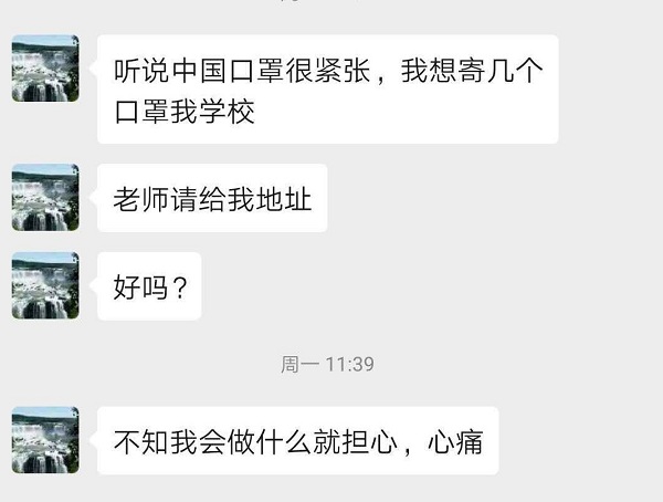穆罕穆德,曾经在学校学习了六年,毕业后在外交部门工作,他在了解疫情后向国际教育学院老师说,“我对中国有很深的感情,老师把我们照顾得很好,这是我的第二故乡,我一定要尽我的力量帮助学校。”国际学生校友在了解疫情后,在问候母校的同时,纷纷向学校伸出了援助之手,先后有俄罗斯、柬埔寨、埃及、伊朗、摩洛哥、越南、乌兹别克斯坦等国家的国际学生校友提出捐赠口罩等物品。