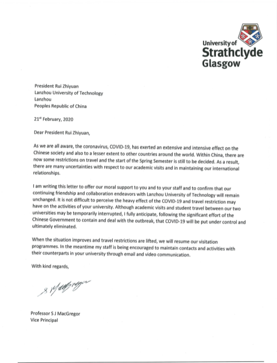 英国斯特莱斯克莱德大学副校长S J MacGregor在给芮执元校长的来信中说到,“两校多年以来结下的合作友谊丝毫不会受到影响。尽管两校学生交流因疫情突发而被迫临时中断,但我相信,随着中国政府和人民的有效防控和努力应对,新冠病毒最终会被消灭殆尽,校际交流将会很快恢复”。