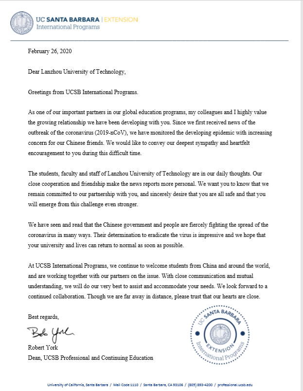 山川异域,风月同天。在兰州理工大学师生众志成城抗击新冠肺炎疫情的特殊时刻,英国斯特莱斯克莱德大学、美国加州大学圣芭芭拉分校等海外合作院校纷纷来信慰问我校师生,表达了对我国抗击疫情胜利的信心,和与学校继续加强、开展国际交流合作的坚定意愿。