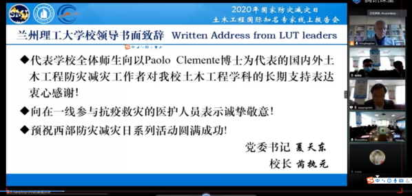 针对今年的病毒蔓延引发全球公共卫生灾害特殊情形,兰州理工大学校校领导在活动开幕式上发表书面致辞,代表我校全体师生向以Paolo Clemente博士为代表的国内外土木工程防灾减灾工作者对我校土木工程学科的长期支持表达衷心感谢,向在一线参与抗疫救灾的医护人员表示诚挚敬意。