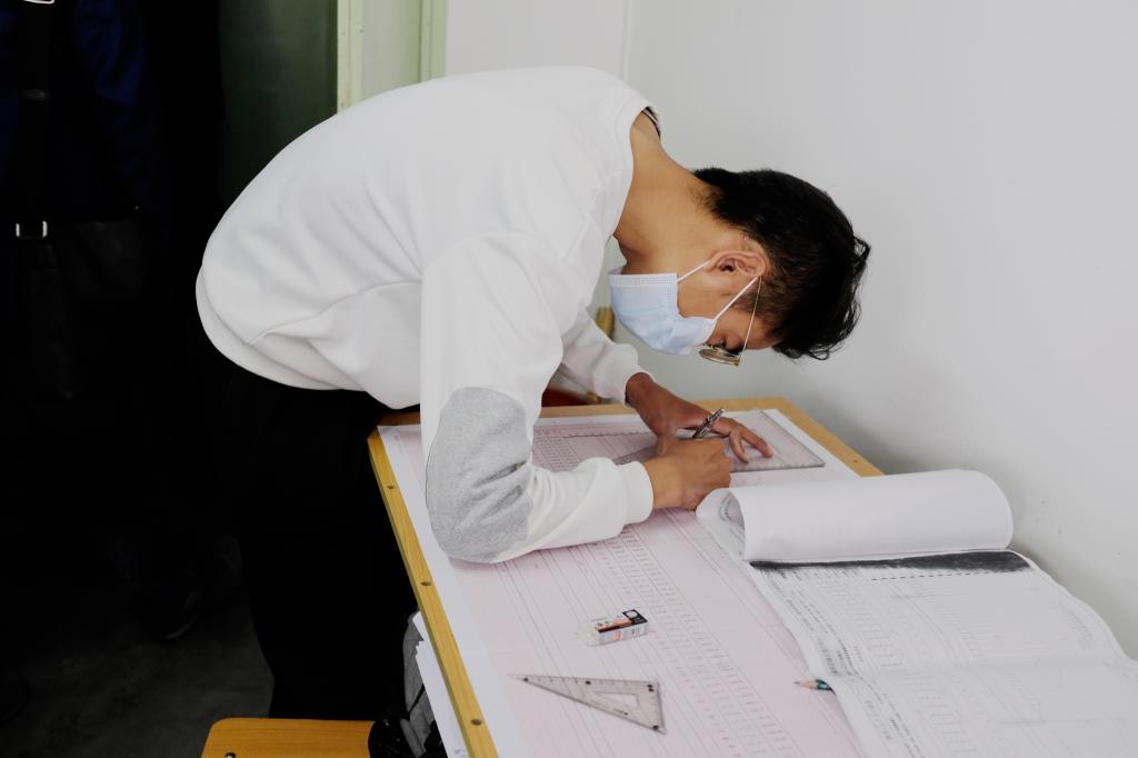 19级建筑学一班梁文娇说:“我们今天上的是《建筑初步》这门专业课,早上四个小时都是这节课,但是我们会将一个大班分为四个小班,每一批来四位同学,老师进行一对一辅导,比起线上课程我觉得线下课程会更加清楚一些,每一个人的设计图纸有什么问题,老师都会在现场详细耐心的讲解。”