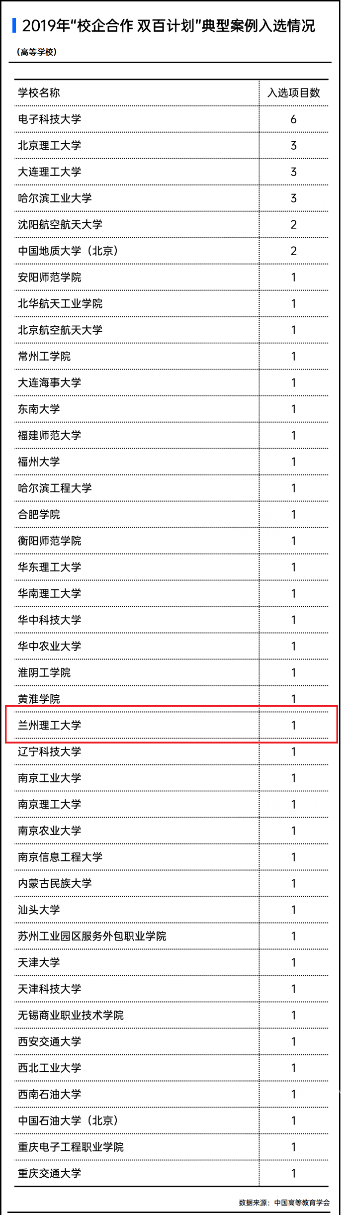 2019年5月,中国高等教育学会启动了中国高等教育博览会“校企合作 双百计划”典型案例推选工作。材料学院向高教博览会提交四个校企合作项目。2019年11月,学院材料成型及控制工程专业与宁夏共享集团共建的“基于卓越工程师计划的材控实践基地建设”案例及高分材料与工程专业与中国石油兰州化工研究中心共建的“基于工程教育认证的校企共建高分子材料与工程专业建设”案例入选中国高等教育博览会“校企合作双百计划”典型案例并参展。