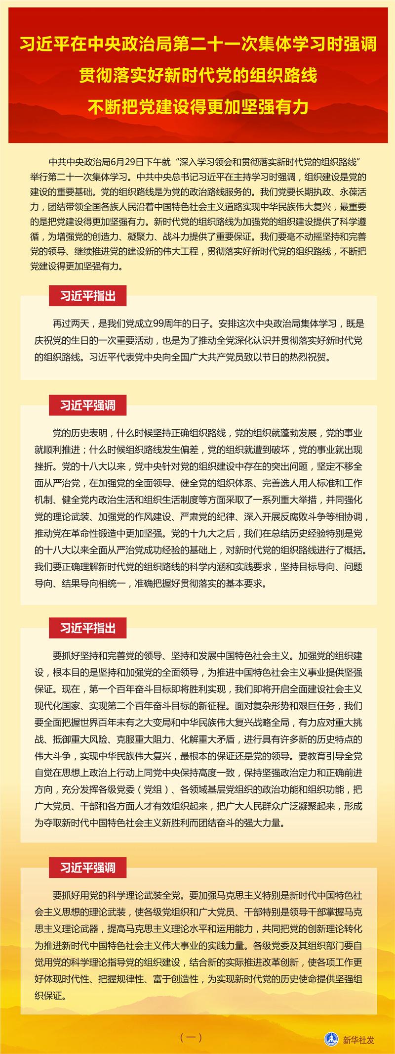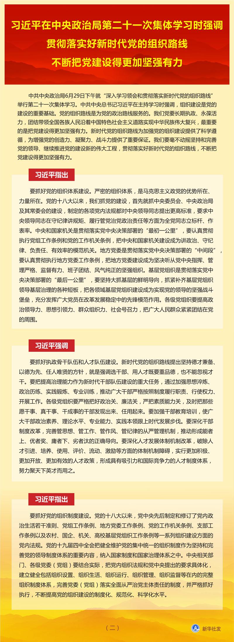 新华社北京6月30日电 中共中央政治局6月29日下午就“深入学习领会和贯彻落实新时代党的组织路线”举行第二十一次集体学习。中共中央总书记习近平在主持学习时强调,组织建设是党的建设的重要基础。党的组织路线是为党的政治路线服务的。我们党要长期执政、永葆活力,团结带领全国各族人民沿着中国特色社会主义道路实现中华民族伟大复兴,最重要的是把党建设得更加坚强有力。新时代党的组织路线为加强党的组织建设提供了科学遵循,为增强党的创造力、凝聚力、战斗力提供了重要保证。我们要毫不动摇坚持和完善党的领导、继续推进党的建设新的伟大工程,贯彻落实好新时代党的组织路线,不断把党建设得更加坚强有力。
