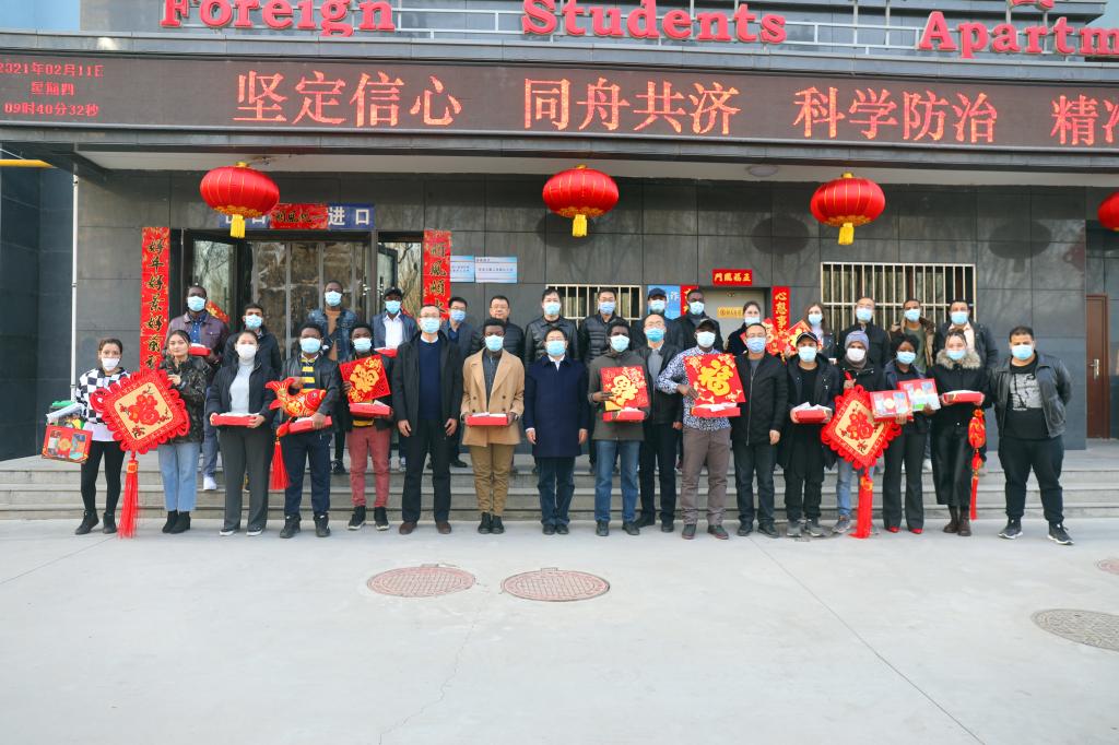 在国际学生公寓楼下,夏天东一行看望慰问留校的各国留学生,与大家联欢互动,共度春节,并送上节日礼物,与师生合影留念。夏书记在讲话中希望全体留学生同学们借中国新年契机多多了解中国文化,传播中华优秀传统文化,争做人类文明交流的使者,并祝愿留学生们学有所成,新春快乐。