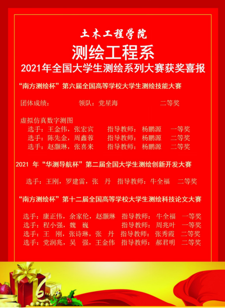 全国大学生测绘系列大赛主要面向国家测绘行业人才培养需求,已经成为创新创业教育的重要平台和广大测绘师生展示风采、追逐圆梦的广阔舞台。我校测绘工程系在接到比赛通知后,在学院指导下进行精心组织和部署,积极动员指导老师组织学生备赛。经过校内选拔赛和全国的预赛,选拔出13组26名学生参加全国大学生测绘系列大赛决赛,经过激烈的角逐,共斩获测绘技能大赛、测绘创新开发大赛和测绘科技论文大赛三类赛项8个奖项的优异成绩,不仅充分展示了我校测绘学生的风采,也体现了我校测绘工程专业创新能力培养水平,为学校争得荣誉的同时,进一步扩大了学科影响力。