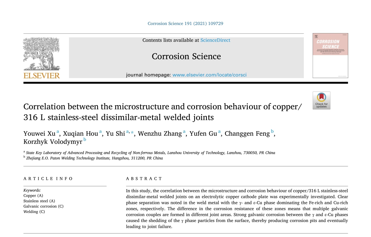 近期,省部共建有色金属先进加工与再利用国家重点实验室石玗教授团队的最新科研成果《Correlation between the microstructure and corrosion behavior of copper/316L stainless-steel dissimilar-metal welded joints》在国际腐蚀科学领域TOP期刊Corrosion Science(影响因子7.205)在线发表。该研究工作是由国家重点实验室与浙江巴顿焊接技术研究院合作完成,第一作者为许有伟讲师,通讯作者为石玗教授。