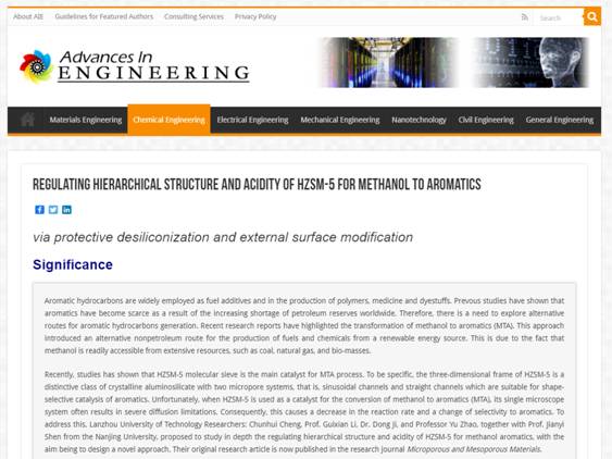 近日,国际著名工程学网站“Advances in Engineering”(AIE)专题报道了我校石油化工学院赵鹬副教授、李贵贤教授课题组在甲醇制芳烃反应领域对HZSM-5分子筛催化剂精准调控研究成果。