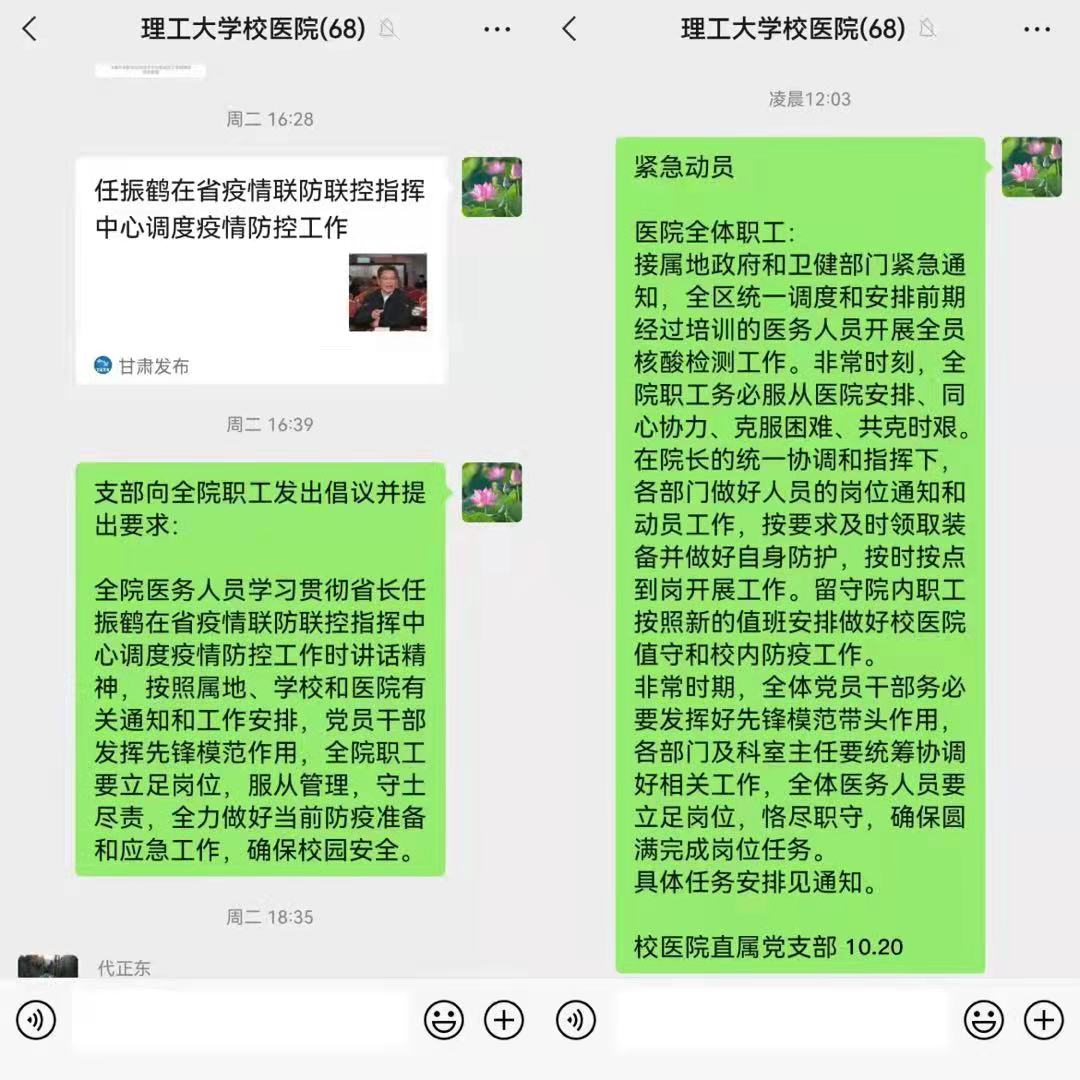 10月20日晚上9点学校接到七里河区紧急通知,校医院28名医务人员被抽调到九个社区承担辖区重点区域人员核酸检测釆样工作。接到通知后,支部对全体医护人员连夜紧急动员,校医院连夜召开相关会议,启动应急方案,院长安排布置相关工作,办公室连夜到区上领取采样医疗物资,天还未亮28名医务人员义无反顾奔赴抗疫一线指定地点开展核酸检测工作。非常时期医院上下服从调度、同心协力、克服困难、共克时艰,党员干部发挥先锋模范带头作用身先士卒,全体医务人员立足岗位、恪尽职守,留守院内职工按照新的值班安排做好校医院值守和校内防疫工作。
