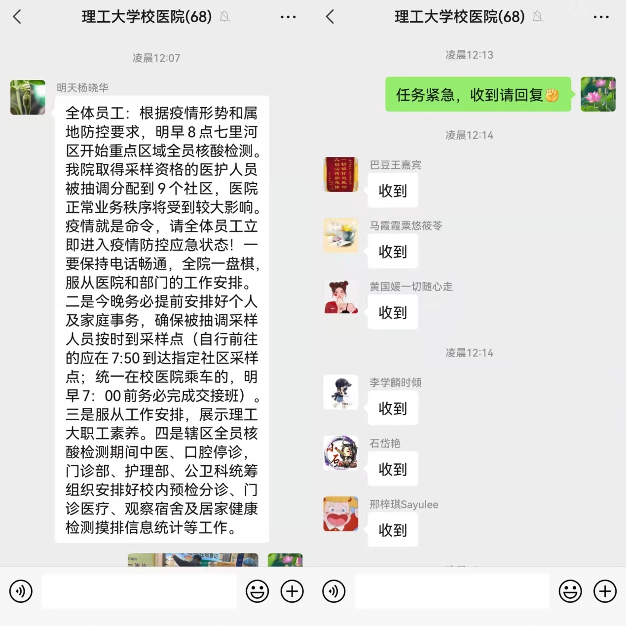 疫情就是命令,防控就是责任。10月20日,根据疫情防控需要,学校对需要集中观察的学生进行摸排并统一安排到彭家坪校区进行隔离,校医院联系第三方检测机构为我校附属中学学生和学校重点人群开展核酸检测,一天共完成1400人核酸检测任务。