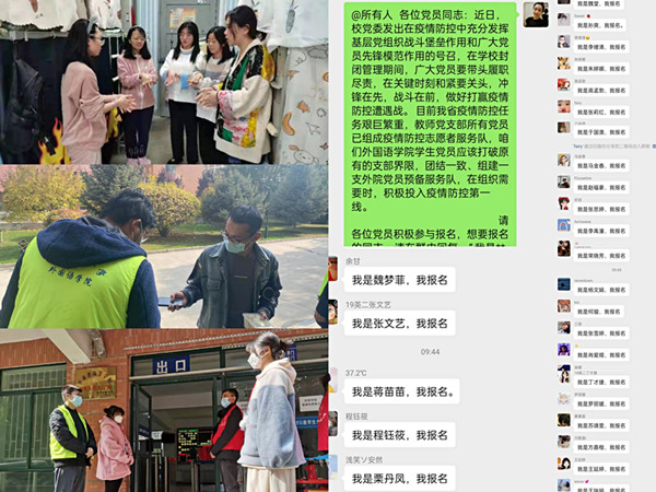 面对突如其来的疫情,外国语学院党委强化责任担当、认真开展工作,成立阻击疫情“党员先锋号”志愿服务队,学院全体党员积极响应、主动作为、迅速行动、纷纷报名参“战”,积极投身防疫一线,当好疫情防控服务员、监督员、宣传员和引导员,主动参与疫情防控服务、监督劝导、知识普及、宿舍保障等工作,构筑起坚实防疫战线。