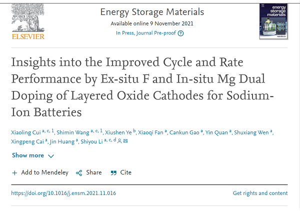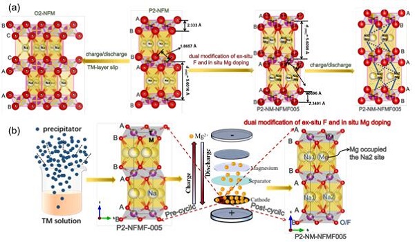 近日,学校石油化工学院教师崔孝玲、2018级硕士研究生王诗敏以共同一作在工程技术领域TOP期刊《Energy Storage Materials》(中科院一区,影响因子17.789)发表题为“Insights into the improved cycle and rate performance by ex-situ F and in-situ Mg dual doping of layered oxide cathodes for sodium-ion batteries”(DOI:10.1016/j.ensm.2021.11.016)的高水平研究论文。李世友教授为论文通讯作者,石油化工学院、依托我校建立的甘肃省低碳能源化工重点实验室分别为论文第一、第三完成单位。