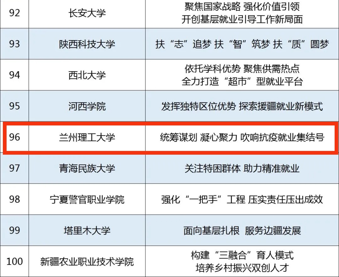 兰州理工大学深入学习贯彻习近平总书记关于高校毕业生就业创业的重要指示批示精神,认真落实“六稳”“六保”工作要求,用心、用情、用力,构建出纵向到底、横向到边的就业工作网络,立足让毕业生实现更加充分和更高质量就业这一根本出发点,全校上下同频共振、同向同行,全面构建了基础保障、校园招聘与市场开拓、就业指导与服务、就业反馈“四位一体”的就业工作体系,形成了“党委抓总、行政抓实、部门协同、校院联动、全员参与”的良好工作格局。