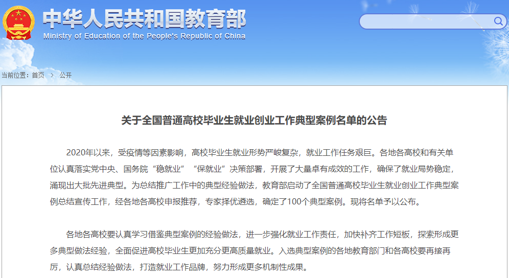 日前,教育部启动全国普通高校毕业生就业创业工作典型案例总结宣传工作,经各地各高校申报推荐,专家择优遴选,确定了100个典型案例。我校主题为《统筹谋划凝心聚力 吹响抗疫就业集结号》的案例事迹成功入选。