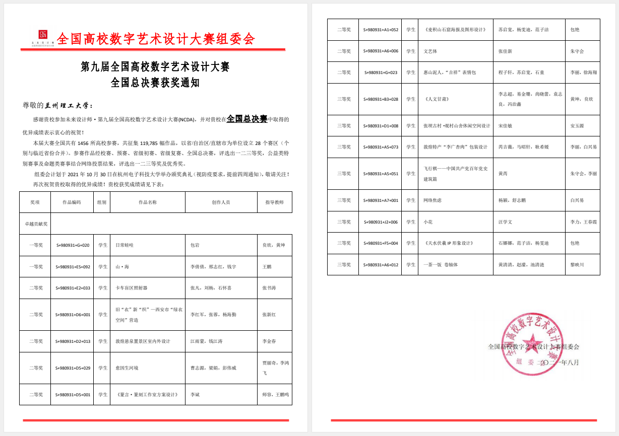 本届大赛共有1456所高校参加,参赛作品近12万幅。我校设计艺术学院在本届赛事中荣获佳绩,共获得国家级一等奖2项、二等奖8项、国家级三等奖8项。学院在学校创新创业学院等部门的组织协调下,负责承办了甘肃赛区的具体参赛事宜,得到了全国组委会和兄弟院校的高度肯定,学校在团体组织奖中获得“卓越贡献奖”,甘肃赛区获评“优秀赛区”。