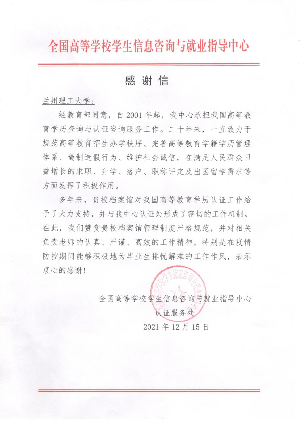 感谢信中说,多年来,兰州理工大学档案馆对我国高等教育学历认证工作给予了大力支持,并与全国高等学校学生信息咨询与就业指导中心认证处形成了密切的工作机制。在此,我们赞赏学校档案馆管理制度严格规范,并对相关负责老师的认真、严谨、高效的工作精神,特别是在疫情防控期间能够积极地为毕业生排忧解难的工作作风,表示衷心的感谢!
