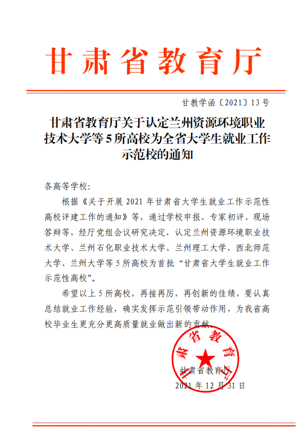 2021年9月,甘肃省教育厅组织开展2021年甘肃省大学生就业工作示范性高校评建工作。经学校申报、专家初评、现场答辩、教育厅党组会议研究决定,认定兰州资源环境职业技术大学、兰州石化职业技术大学、兰州理工大学、西北师范大学、兰州大学等5所高校为首批“甘肃省大学生就业工作示范性高校”。