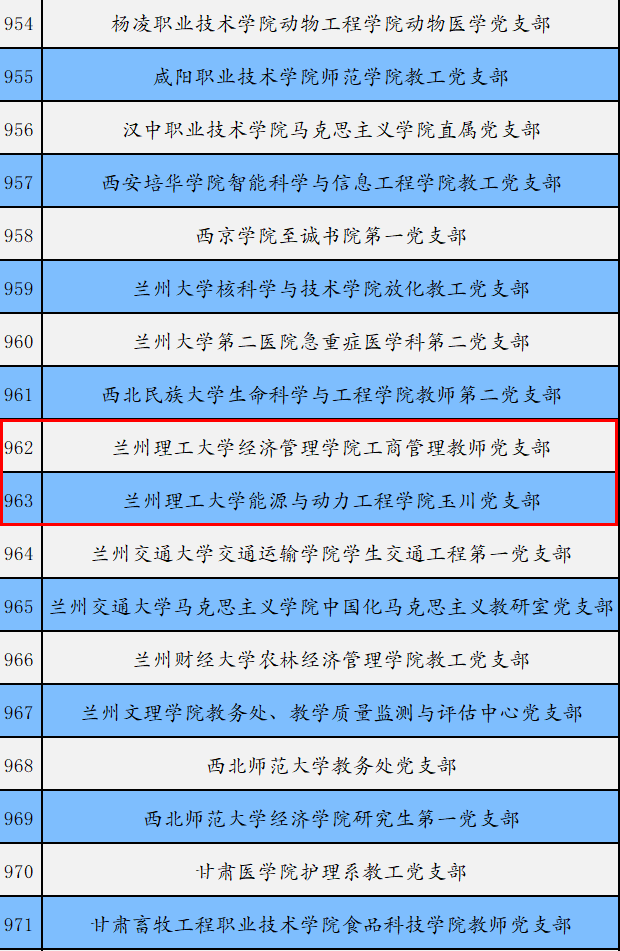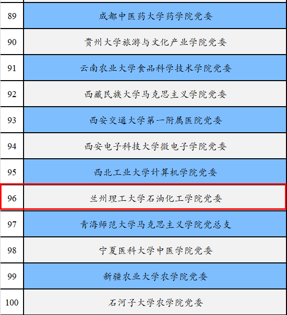 近日,教育部思想政治工作司公示第三批新时代高校党建示范创建和质量创优工作遴选结果,兰州理工大学石油化工学院党委入选“全国党建工作标杆院系”,经济管理学院工商管理教师党支部、能源与动力工程学院玉川党支部入选“全国党建工作样板支部”。