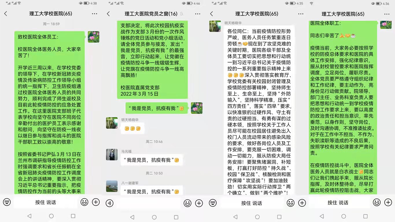 本轮疫情以来,校医院班子成员团结合作、分工负责,院务群每天工作到凌晨2、3点已成为家常便饭。特别是杨晓华院长废寝忘食、殚精竭虑,不厌其烦的修改和完善每天的战“疫”方案,确保院感防控、核酸采集、样品检测、物资储备等各项工作不出疏漏。院领导和部门主任各司其职,共同守护师生的身体健康和生命安全,在学校统一指挥下,全力打赢这场疫情防控阻击战。