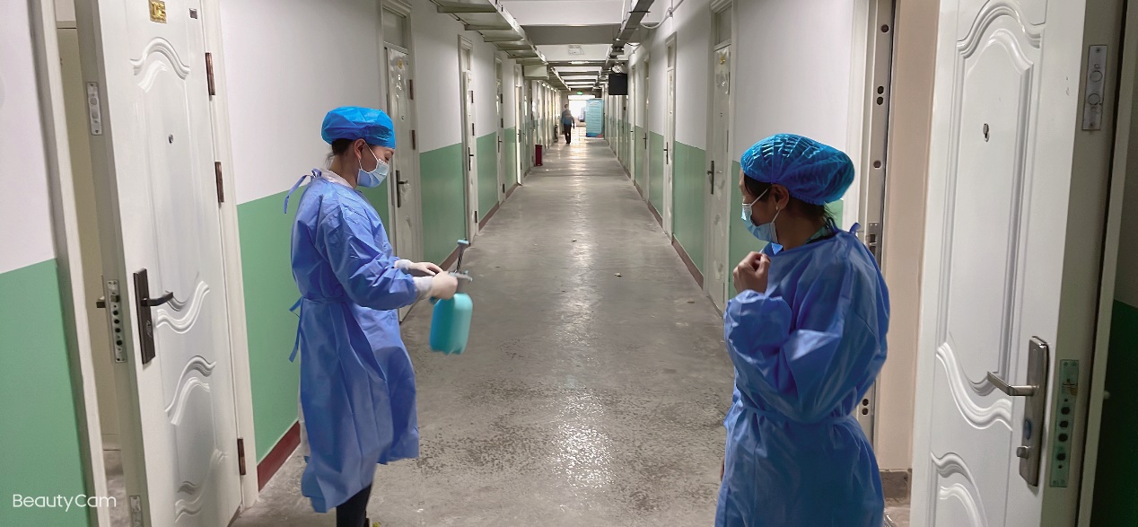 校医院护理部有护士20人,承担了两校区预检分诊、住院及留观患者治疗护理、隔离观察宿舍留观学生的治疗护理及消毒培训、院感检查和核酸采样等工作任务。疫情发生以来,发热患者的就诊程序复杂,留观人数较多,床位周转率高。观察宿舍及病区每日每名护士拆铺床位10余张,加之输液、抽血、注射、换药、消毒灭菌、给留观学生订餐、取餐,每一位护士都是奔跑的“天使”,处处展现着护理人员的仁爱之心。隔离观察宿舍的值班护士都是连续24小时值班中,门诊及病区24小时值班护士夜班后还得承担采样任务。全员采样后,由于护理部人手不足,护士长肖淑红端着治疗盘穿梭在医院楼梯间,问及是不是人员排不开时,护士长的回答是:“她们真的很辛苦,这也是我的本职……”,其实护士长负责采样队伍的排班及场地组织工作,连续的作战也已经很疲惫了。