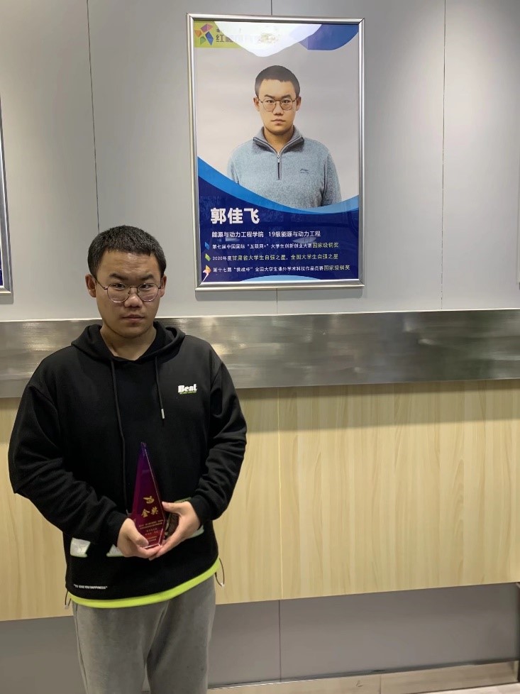 郭佳飞出生于一个贫困家庭,从小刻苦努力,乐观积极。在“三下乡”社会实践过程中发现北方地区农村厕的防冻问题严重,于2019年组建“红柳极客”团队,2021年5月合作成立兰州红柳极客环保科技公司。三年来,深入五市十二村,行程足迹9.6万余公里,安装厕所200余台,推动了“厕所革命”的步伐,促进了村民居住环境的改善。目前已推出三代产品并交付使用,实现产品跨越不同地域、节水环保、清理周期长、体积小、冬季正常使用的特点,解决了市场需求遇到的难点和困点。团队和产品成为校内创新创业训练实践成功案例之一,形成巨大反响。2021年6月22日受邀参加教育厅主办活动“青年红色筑梦之旅”,得到省领导的高度认可,被百度网、搜狐网、网易网、凤凰网、新华网、腾讯网、新浪网等多家网络媒体相继报道。截止目前,团队共计成员43人,覆盖产品研发、项目管理等各个环节,并规划两年内发展120人,超500余人将在其产业链中就业。热爱科创,获得奖项国际级1项,国家级12项,省部级15项,校级29项;获批主持省级大学生创新训练计划1项;授权实用新型专利8项;授权外观设计专利1项。