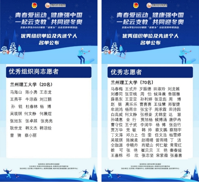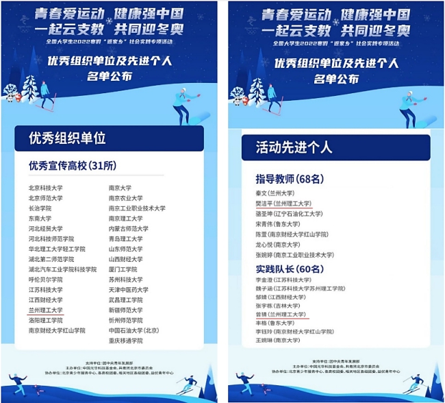 近日,由团中央青年发展部作为支持单位,中国光华科技基金会与共青团北京市委员会联合主办的“青春爱运动 健康强中国 一起云支教 共同迎冬奥”全国大学生2022年寒假“返家乡”社会实践专项活动圆满落幕,我校积极参与该项活动,并取得荣获多项荣誉,包括“优秀宣传高校”1项,优秀指导老师1名,优秀实践队长1名,优秀组织岗志愿者20名,优秀志愿者70名。