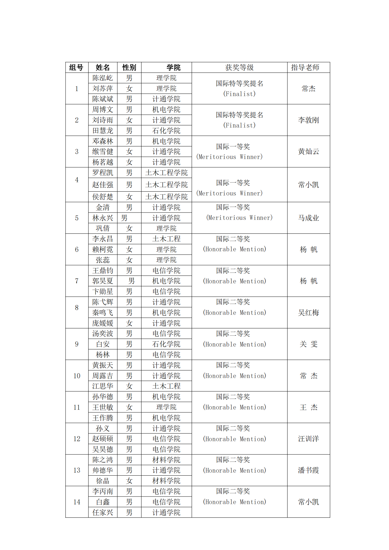 近日,2022年美国大学生数学建模竞赛评奖结果揭晓,我校学子,在理学院数学建模团队指导下,顽强拼搏、不负众望,共获得国际特等奖提名(Finalist winners)2项,国际一等奖(Meritorious Winner)3项,国际二等奖(Honorable mentions)9项的好成绩。
