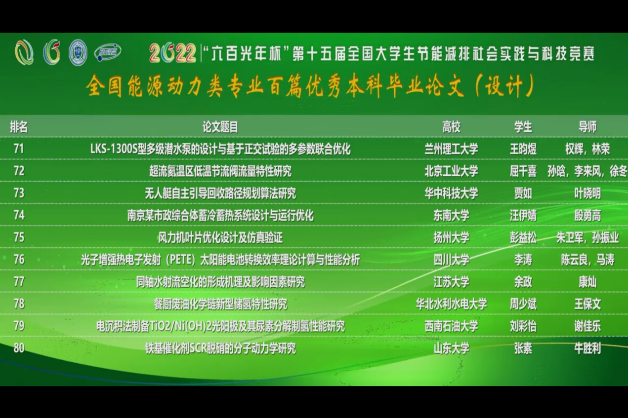 近日,教育部高等学校能源动力类专业教学指导委员会主办的2022年(第二届)全国能源动力类专业百篇优秀本科毕业论文(设计)在线展示交流活动圆满结束,能源与动力工程学院2018级能动卓越班毕业生王昀煜同学,获得2022年(第二届)全国能源动力类专业百篇优秀本科毕业论文(设计)。