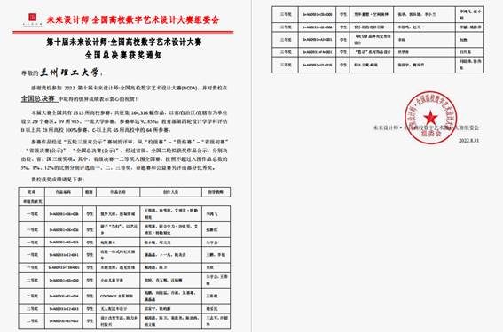 近日,未来设计师·全国高校数字艺术设计大赛组委会发来通知,我校学生在该项赛事的全国总决赛中再获佳绩,共获得一等奖5项、二等奖4项、三等奖5项,奖项覆盖人居环境类、视觉传达类、动画与视频类、工业产品类、时尚类、虚拟IP及表情包类和公益类。本届大赛全国共有1513所高校参赛,共征集164316幅作品,参加全国总决赛参赛作品须经过“五轮三级双公示”赛制的评审。其中,甘肃赛区14所参赛院校的大学生共获得一等奖8项、二等奖12项、三等奖11项,我校获奖数占甘肃赛区大学生组获奖总数的45.16%。同时,作为甘肃赛区的承办院校,我校出色完成了甘肃赛区赛事的各项工作,在团体组织奖中荣获“卓越贡献奖”。