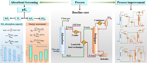 碳捕集、利用与封存(CCUS)是我国实现“2030碳达峰、2060碳中和”目标技术组合中的重要构成部分,烟气脱硫是碳捕集过程的重要环节。低能耗CO2/SO2捕集技术的开发是绿色催化与过程工程团队的一个重要研究方向。SO2捕集过程中的再生能耗需求与脱硫剂(内因)和工艺流程(外因)两个因素密切相关。文章构建了基于量子化学计算、实验分析验证、过程建模等多尺度方法相结合研究方法,从脱硫剂的内因角度,降低解吸过程中再生反应热的能耗需求,基于脱硫剂的能耗分布特性,开发与脱硫剂相匹配的改进工艺,从工艺流程结构优化的外因角度,降低解吸过程中显热和潜热的能耗需求,最终形成基于脱硫剂与工艺流程相匹配的低能耗SO2捕集工艺。本研究对于提升胺基脱硫剂SO2捕集工艺的工业应用潜力具有重要的意义。