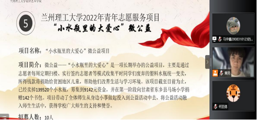 近年来,校团委高度重视大学生志愿服务工作,不断探索志愿服务的新模式,通过举办志愿服务项目征集、志愿服务项目双选会、校级志愿服务项目大赛等多项活动,挖掘和培育了一批优质青年志愿服务项目,有效推动了我校志愿服务工作的专业化、制度化、品牌化发展,营造了浓厚的志愿服务氛围。(撰稿人:刘沂蒙 审稿人:王文霞)