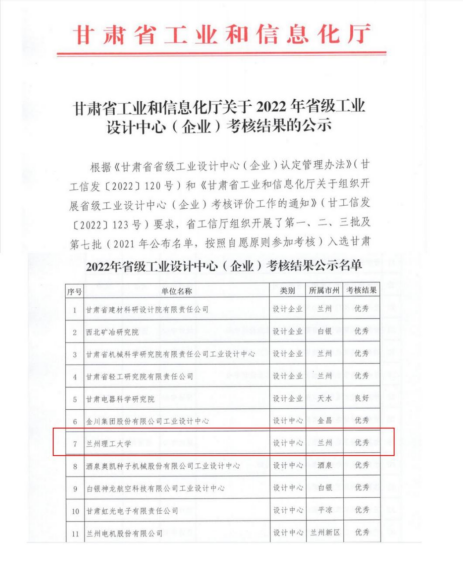 近日,甘肃省工业和信息化厅发布2022年49家省级工业设计中心和5家省级工业设计企业考核结果公示名单,兰州理工大学工业设计中心顺利通过考核,被评定为优秀。