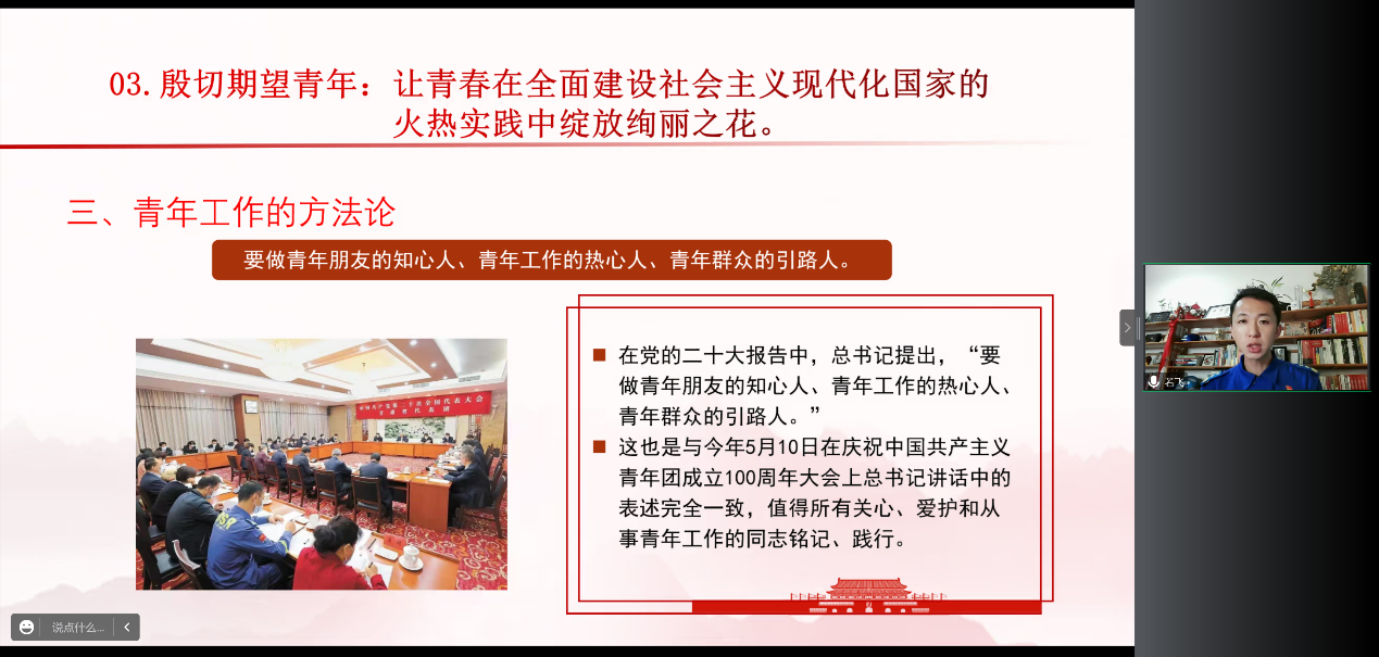 他从青年工作的定位、青年思想引领、青年工作的方法论、青年与时代的深刻关系、对青年的殷切期盼等五个方面重点对习近平总书记在二十大报告中与青年的相关论述作了详细的解读。他认为,党的二十大报告中关于青年的这段话是对青年未来发展的长远期望和深切嘱托,希望广大青年把总书记嘱托放在心里,印在脑中,用来指导个人成长。他结合自身学习成长经历、参与尼泊尔地震救援的故事,对新时代青年提出了三点建议,一是要听党话、跟党走,树立崇高理想信念;二是要用党的科学理论武装自己,不断练就过硬本领;三是要理性看待名利得失,宠辱不惊并脚踏实地。