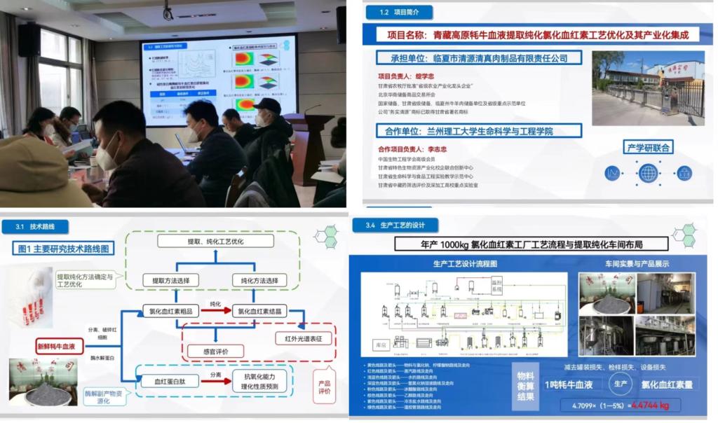 验收专家组认为李志忠教授团队和“清源公司”合作,利用牦牛血液提纯氯化血红素工艺优化研究提高了产品附加值和科技含量,达到了“科技为企业纾困”的目的。李志忠教授对专家组提出的深化校企合作,加快企标备案和扩大产品销售等宝贵意见表示感谢。未来本团队将以“产学研”为契机,抓住机遇,与“清源公司”持续开展联合攻关,在氯化血红素纯度提高、血红蛋白肽制备和超氧化物歧化酶提取等方面勇当科技和产业创新的开路先锋,争取为培育高新技术产业做出新贡献。(撰稿:郭晓鹏、王永刚 审核:穆龙)